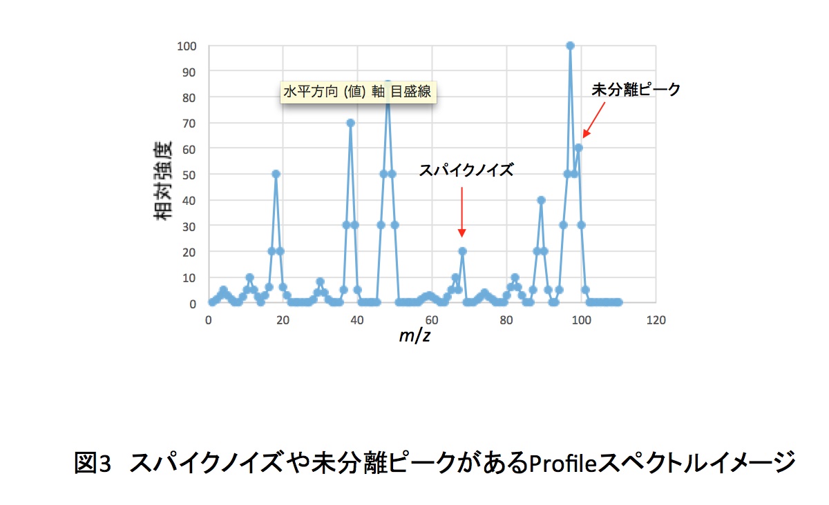 図3に示すように、何等かの理由で、マススペクトル取得時にm/z 60付近にスパイクノイズが入ったとします。Profile → Barへの変換におけるパラメーター設定において、スパイクノイズはピークと見なされず無視される事もありますが、ピークとして認識されてしまう可能性を100 %否定する事は出来ません。