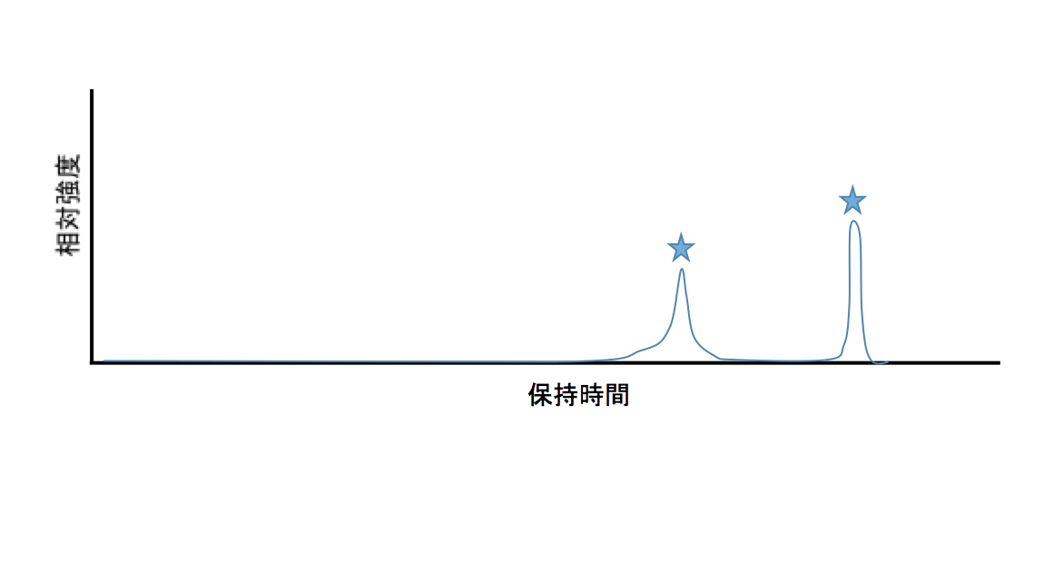 ブランク試料のTICクロマトグラムで観測されている星印の2ピークは、分析試料のTICクロマトグラムにも観測されており、これらはブランク試料由来の夾雑成分である可能性があり、即ち試料由来の成分ではないということになります。ここで、もしブランク試料を測定しなければ、夾雑成分含めて全て試料由来の成分であると誤解してしまうかも知れず、誤った分析結果が得られてしまう可能性があります。