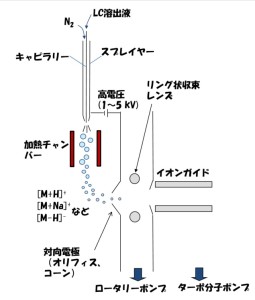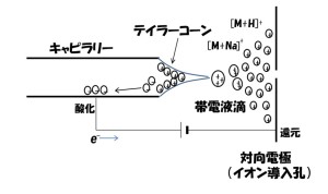 ESIでは、図1に示すように、キャピラリー先端部の液体の塊から、静電的な引力によってイオンが液滴として引きちぎられることによって帯電液滴となり、脱溶媒⇒液滴の分裂⇒イオンエバポレーションを経て、気相イオンが生成します。