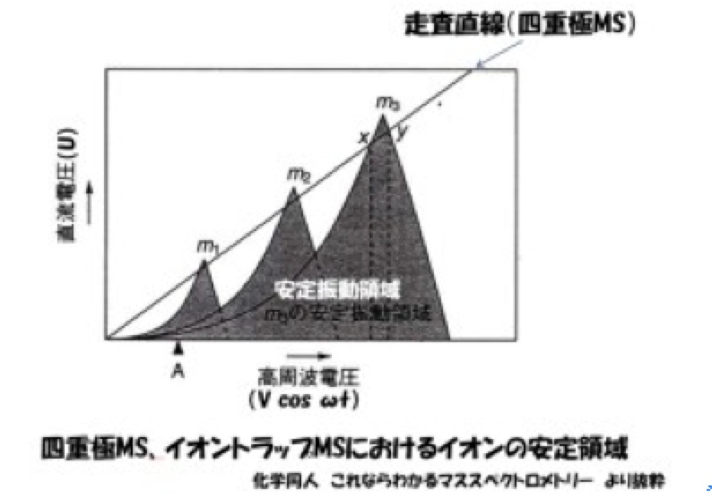 図1に示すように、4本の電極のそれぞれ対角線の対の2電極に対して同極性の直流電圧と高周波電圧を印可し、周期的に極性を変化させることで、イオンは4本の電極内に閉じ込められ、イオン源から検出器までを振動しながら飛行します。図2に示されている三角形様の図は、安定領域と言って、直流電圧と高周波電圧の大きさにおいて、どの位の電圧の時にどの大きさのm/zのイオンが安定に四重極内に存在出来るかを示しています。安定振動領域にあるイオンは検出器へ到達し、安定振動領域にないイオンは途中で四重極外へ排出されます。また図2に示すように、直流電圧と高周波電圧の比が一定になるように電圧を変化させることで、イオンのm/z を分離する事が出来ます。