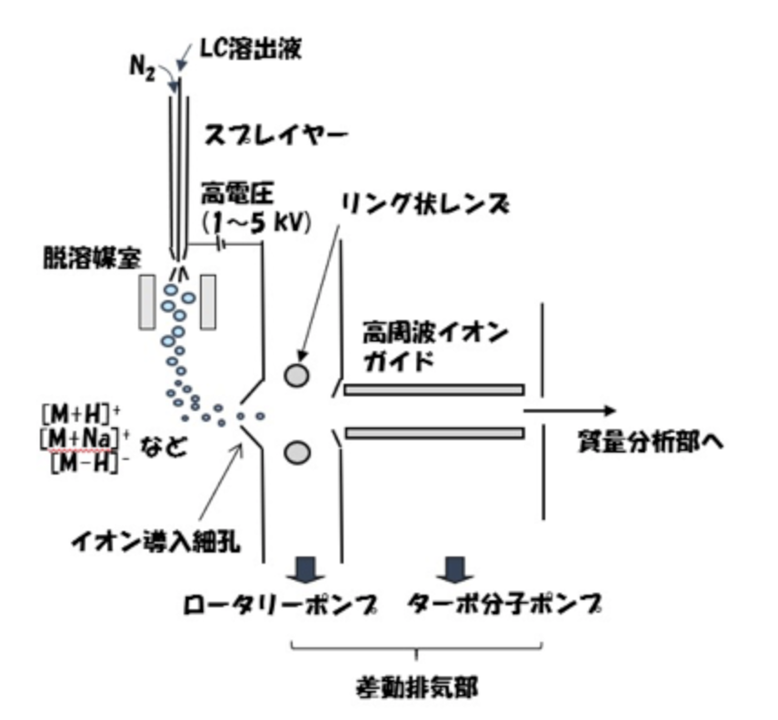 質量分析屋の高橋です。以前のブログで、イオン導入細孔の設定電圧とマススペクトルパターンの変化について書きました。イオン導入細孔は、ESIやAPCIなどの大気圧イオン源において、大気圧で生成したイオンが真空領域に入っていく時に最初に通過する細孔です。図1をご参照下さい。
