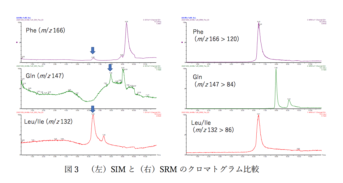 前述したように、Q-MSは質量分解能が低いため、SIMでは選択性が十分でないケースがある。しかし、Q1を分析種イオンと一緒に通過してしまうイオンがあるとしても、開裂によって生成したプロダクトイオンのm/z値まで同一になる可能性は低くなります。3種類のアミノ酸混合物の、SIMとSRMにより得られたクロマトグラムの比較を図3に示します。標準試薬の混合物であるため、夾雑成分などは少ない筈ですが、SIMではベースラインが高く、他のピークが高く検出されているクロマトグラムもあります。一方、SRMでは各アミノ酸のピークが明瞭に検出されています。