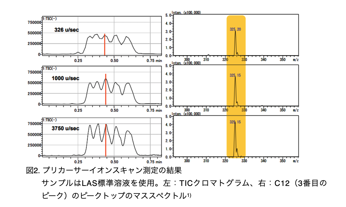 MS2が電圧走査(スキャン)型の質量分離部ではないからと言ってしまえばそれまでですが、MS/MSの動作を考えれば容易に理解できます。TOFとOrbitrapの共通点は、質量分離部に対して、イオンをパルスで打ち込む事です。Q-TOFやQ-OrbitrapのMS/MSで、プリカーサーイオンスキャンの動作が可能かどうか、ここで考えてみましょう。先ずQをスキャンしてイオンをm/zの小さい順に通過させ、q(コリジョンセル)でCIDによって開裂させます。そのプロダクトイオンを、一定時間毎に、Q-TOFの場合は直交加速によってTOFに、Q-Orbitrapの場合はCトラップからOrbitrapに、パルス状に打ち込みます。この「一定時間イオンを貯める」動作によって、プリカーサーイオンとプロダクトイオンの関係性が失われてしまう事が、これらの装置でプリカーサーイオンスキャンが出来ない理由です。プロダクトイオンスキャンの応用例として、陰イオン界面活性剤である直鎖アルキルベンゼンスルホン酸ナトリウム(LAS)のデータを図2に示します1)。LASの負イオンESIにより得られた[M-H]-をプリカーサーイオンとしたプロダクトイオンスペクトルにおいては、直鎖の炭素数に依らずm/z 183イオンが生成します1)。このm/z 183イオンを設定したプリカーサーイオンスキャン測定のデータが図2です。