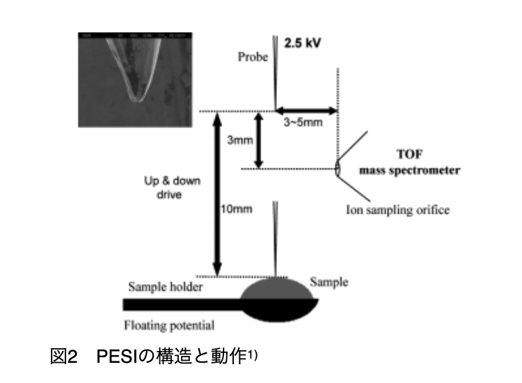 山梨大学の平岡先生が開発された「探針エレクトロスプレー」という技術があります。そのイオン生成機構が、そのまま前回解説の補足になります。探針エレクトロスプレーは、英語ではprobe electrospray ionizationとなり、PESIと略されます。PESIについては、平岡先生の総説1)をご参照ください。ESIは、コンベンショナルからナノまで、サイズによって量は大きく変わりますが、キャピラリー先端部分では試料溶液は連続流体として供給されています。一方PESIは、探針の先端に試料溶液を付着させ高電圧を印加する事で、探針の先端に形成されたテイラーコーンから直接イオンが生成するイメージです。コンベンショナルESI、ナノESI、PESIの比較と、PESIに用いた探針先端のSEM画像を図1に示します。また、PESIの構造と動作の様子を図2に示します。