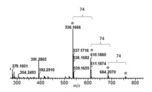 ☆印を付けた4つのピークのm/z差は何れも約74であり、これは(CH3)2SiOに相当します。これらのピークがシロキサン即ちケイ素原子を複数個含む化合物由来である事が判断できる理由は、各ピークの同位体パターンです。最も強度の高いm/z 536イオンはモノアイソトピックピークであり、m/z 537, 538, 539は同位体イオンです。この同位体を含むピーク群は、非常に特徴的な同位体パターンを示しています。それは、m/z 536ピークに対して+1および+2の同位体ピークの相対強度が非常に高い事です。+1は約45%、+2は約30%を示しています。通常の有機化合物の構成元素はC, H, N, O, P, S, Clなどですが、+1の同位体ピーク強度に寄与する元素は主にC、+2の同位体ピークの強度に寄与する元素はSとClです。図のマススペクトルにおいて、+1の強度からCは40個程度、また+2の強度から、Clであれば1個、Sであれば7~8個含まれている事になります。