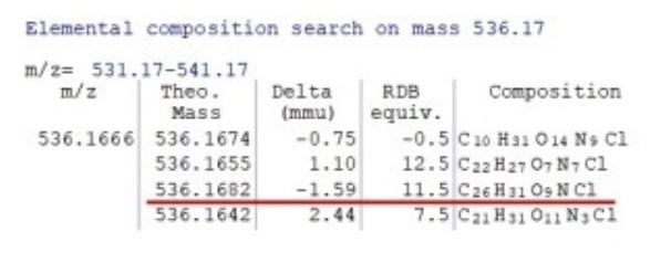 そこで、536.1666のm/z値に対して、Clを1つ含むC, H, N, Oで、許容誤差5 ppmで組成推定を行うと、表1の様な結果が得られました。また、Sを5~10個含む元素候補で計算させた場合、表2の様になりました。