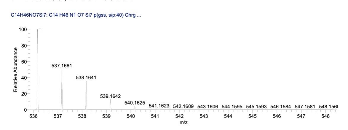 図4のパターンは、実測スペクトルにかなり近く、図1のマススペクトルで観測されているm/z 536イオンの分子式はC14H46NO7Si7であると推測されます。