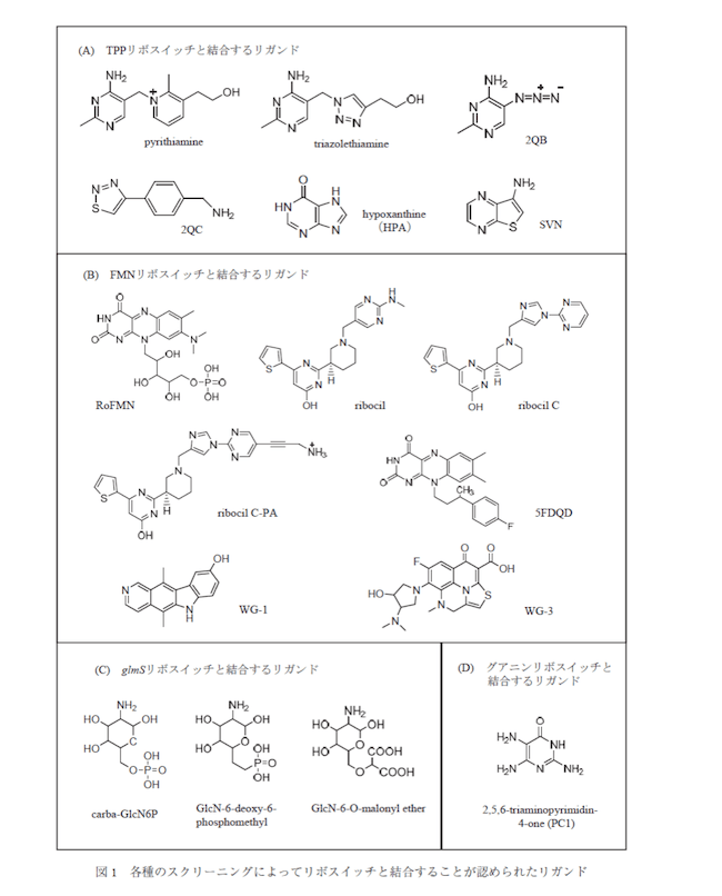 多くの細菌はmRNAの5‘非翻訳領域にリボスイッチと呼ばれる特異的な立体構造を形成するRNA領域を持っています。リボスイッチには様々な種類があり、それぞれに対応する特定の天然リガンド(図1)と特異的に結合して、リボスイッチの下流にある遺伝子の発現を調節します。