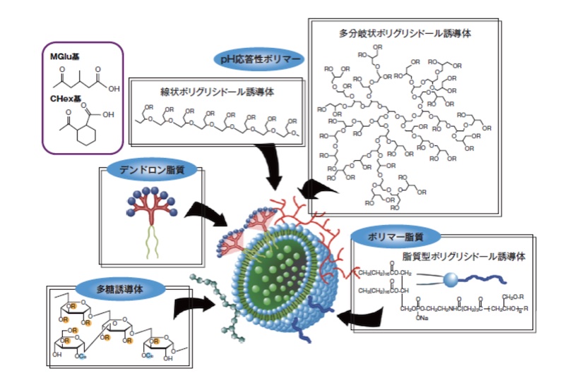 まず、機能性ポリマーにポリグリシドール(PG)をベースポリマーとして用いることを検討しています。このポリマーにコハク酸無水物、3―メチルグルタリル酸無水物、シクロヘキサン―1 ,2―ジカルボン酸無水物を反応させ、スクシニル(Suc)基やMGlu 基、CHex 基(図)をポリグリシドール側鎖に導入することで種々のpH 応答性ポリマーを作製します。更に、これらのポリマーを卵黄ホスファチジルコリン(EYPC)リポソームに複合化すると、中性では安定ですが、弱酸性環境においては不安定で膜融合し、pH 応答性膜融合リポソームが得られることがわかりました。これは、中性ではポリマー側鎖カルボキシ基が解離して荷電するため、高度に水和したポリマー鎖によってリポソーム膜が安定化されますが、pH の低下とともにカルボキシ基がプロトン化され、ポリマー鎖が脂質膜と強く相互作用して不安定化し、膜融合を誘起すると考えられます。中でも、MGlu 基やCHex 基を持つポリグリシドール誘導体は、微弱酸性領域での鋭敏なpH 応答機能をリポソームに与え、優れたpH 応答性膜融合リポソームが生成されました。これらのpH 応答性基は、多分岐状ポリグリシドールや多糖類など、さまざまな分子鎖構造を有するポリマーに対して高いpH 応答機能を与え、多様なpH 応答特性を持つリポソームの作製が可能になりました。