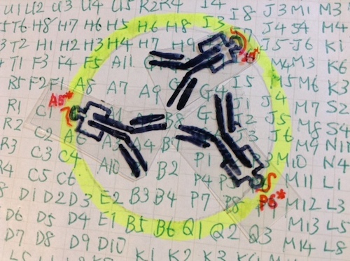 図3:3つの配置では、分子 A5、I7、P6それぞれに対するアプタマー A5*、I7*、P6*(赤色)が生成される。この操作を繰り返して(スキャンして)円周にある生体分子のアプタマーが得られる。