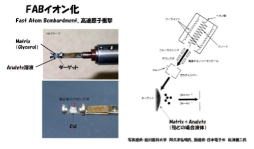 こんにちは! 質量分析屋の髙橋です。最近3回に亘ってイオン化について書いています。EI, CI, FDに続いて今回はFAB。質量分析はイオンを分析する方法なので、何か測定したい試料(その中の特定の成分)がある時、先ずはそれをイオン化しなければマススペクトルを得ることが出来ないので、質量分析の基本は、先ずはイオン化な訳です。
