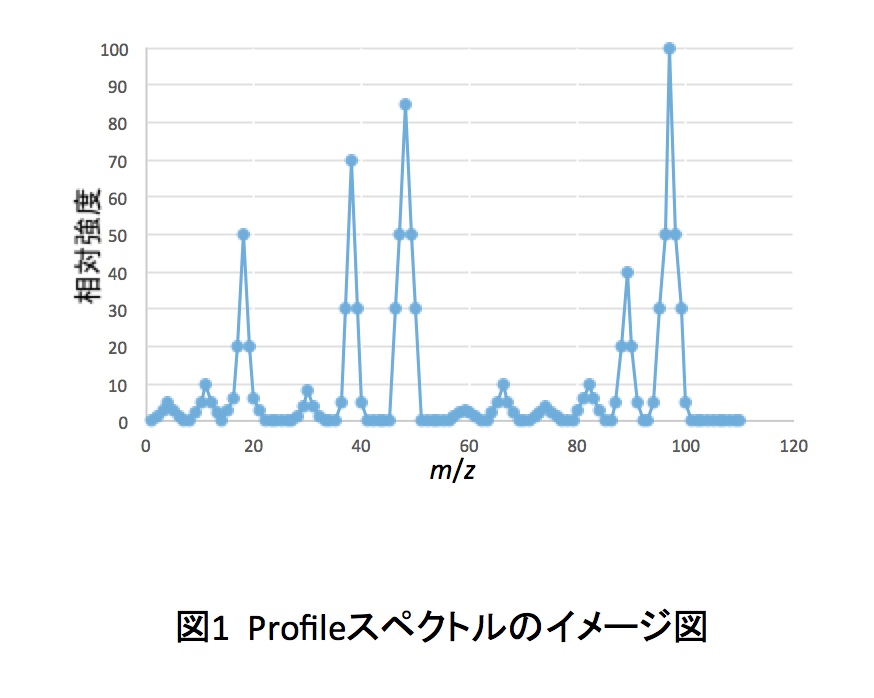 図1はProfileモードで取得したマススペクトルのイメージですが、m/z軸に対して一定間隔のデータポイントをもっています。