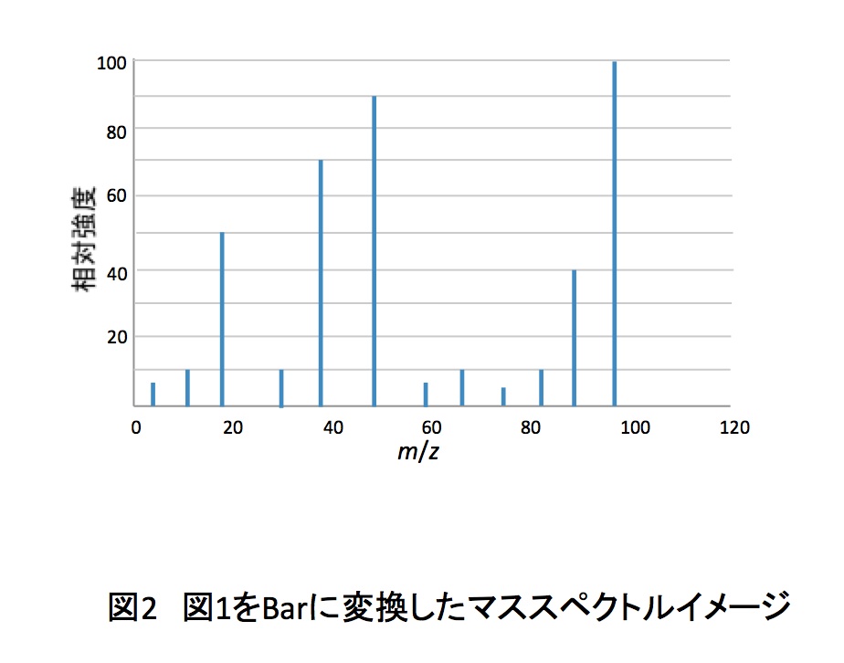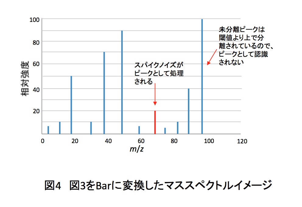 そして、スパイクノイズがピークとして認識されてしまうと、Barへ変換されてしまうため(図4)、ノイズが恰もピークであると言う誤った認識をしてしまう事になります。 また、図3のm/z 100付近に未分離のショルダーピークが検出されたとします。Profile → Barへの変換におけるピーク分離に関するパラメーター設定において、このショルダーピークが認識されないと、Barへ変換される際に無視されてしまいます。