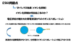 こんにちは! 質量分析屋の髙橋です。LC/MSで汎用的に用いられているイオン化法はESIですが、ESIの大きな問題はマトリックス効果特にイオン化抑制が起こり易い事です。ここでは、、“ESIでイオン化抑制が何故起こるのか”について解説したいと思います。因みに、この内容の多くは、山梨大学の平岡先生から教えて頂いたことです。