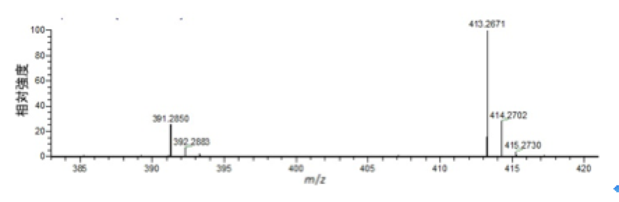 前述のm/z 391は、DOPのプロトン付加分子([M+H]+)、m/z 413はナトリウム付加イオン([M+Na]+)です。