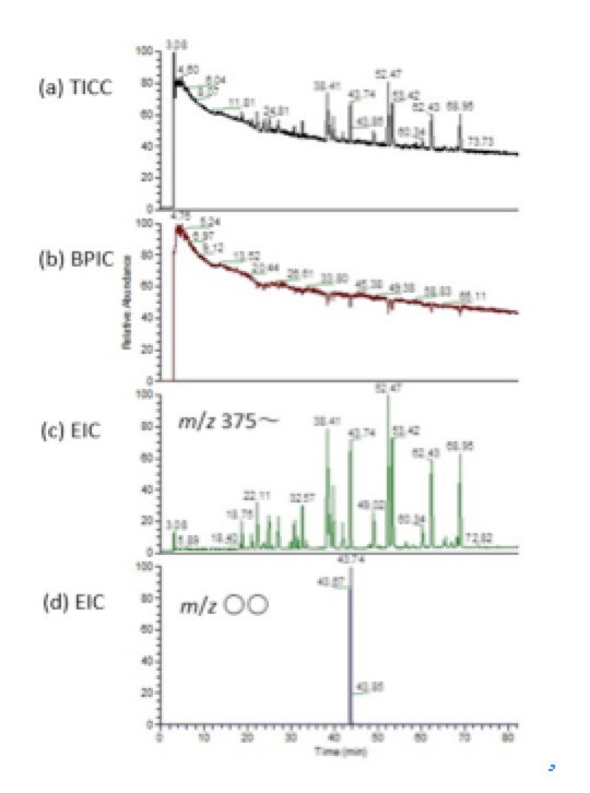 図(d)は、保持時間44分辺りでスライスデータ(マススペクトル)を作成し、そこにメインピークとして観測されていたイオンのm/z値を設定して作成した抽出イオンクロマトグラム(extracted ion chromatogram, EIC)です。LC/MS(GC/MS)のデータ解析でマススペクトルを作成したら、そこに観測されているイオンのm/z値でEICを作成するようにしましょう。顕著なイオンが複数あれば、それらが共溶出している未分離成分由来なのか、同じ成分由来なのかを判断する目安になるし、そのEICで他の保持時間にもピークがあれば、異性体が検出されている可能性もあります。