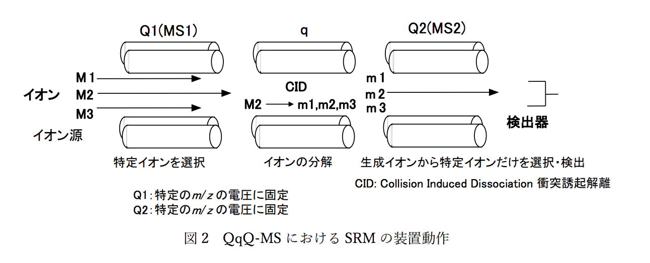 SRMにおけるQqQ-MSの動作を図2に示します。先ずQ1をSIMの設定にして分析種由来の特定のm/zのイオンだけを通過させ、そのイオンをqでCIDによって開裂させ、生成したプロダクトイオンの中から1つまたは複数のイオンのみをQ2を通過させて検出する。即ち、Q2もQ1と同様SIMの動作をさせる事になる。