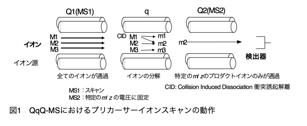 MS2は特定のm/zのイオンのみが通過できるように電圧を固定します。つまり、SIMの状態に設定します。そして、MS1はスキャンモードで動作させます。MS1は、設定したm/z範囲のイオンが小さい方から順番に全て通過し、qでCIDによって開裂してプロダクトイオンが生成します。その中にMS2を通過するイオンがあった場合、その時のMS1の電圧から通過していたプリカーサーイオンのm/z値が分かります。