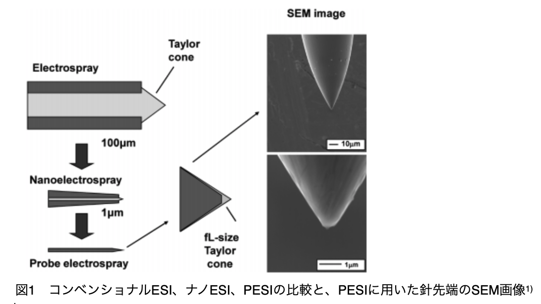 山梨大学の平岡先生が開発された「探針エレクトロスプレー」という技術があります。そのイオン生成機構が、そのまま前回解説の補足になります。探針エレクトロスプレーは、英語ではprobe electrospray ionizationとなり、PESIと略されます。PESIについては、平岡先生の総説1)をご参照ください。ESIは、コンベンショナルからナノまで、サイズによって量は大きく変わりますが、キャピラリー先端部分では試料溶液は連続流体として供給されています。一方PESIは、探針の先端に試料溶液を付着させ高電圧を印加する事で、探針の先端に形成されたテイラーコーンから直接イオンが生成するイメージです。コンベンショナルESI、ナノESI、PESIの比較と、PESIに用いた探針先端のSEM画像を図1に示します。また、PESIの構造と動作の様子を図2に示します。