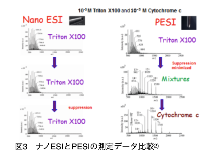 PESIでは、通常のESIの様に試料溶液が供給し続けられる事がないため、高電圧を印加し続ける事により、試料溶液は帯電液滴となってあるいは直接イオンとして、探針表面から放出され徐々にその量は減少していきます。通常のESIでは分析種のイオン化抑制の原因となる物質が試料溶液に含まれているとしても、探針に電圧を印加し続ける事により、イオン化し易い物質が先にイオン化し、その後残りの物質がイオン化される、という現象が起こります。それが顕著に示されている例を図3に示します2)。これは、界面活性剤であるトリトンX100とタンパク質であるシトクロムCの混合溶液を、ナノESIとPESIで測定した時のマススペクトルです。濃度は、トリトンXの方が100倍高い条件です。界面活性剤はイオン化抑制の原因物質の一つなので、この試料はトリトンXの混在によってシトクロムCのイオン化が抑制されて検出されない事を想定したものだと思います。そして、その想定通り、ナノESIではトリトンXのイオンのみが検出され、シトクロムCイオンは検出されていません。