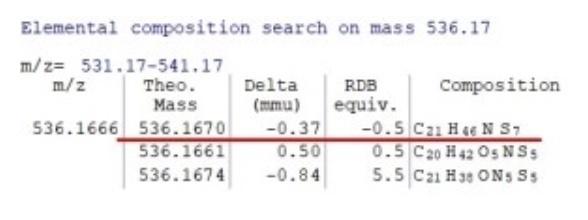 そこで、536.1666のm/z値に対して、Clを1つ含むC, H, N, Oで、許容誤差5 ppmで組成推定を行うと、表1の様な結果が得られました。また、Sを5~10個含む元素候補で計算させた場合、表2の様になりました。