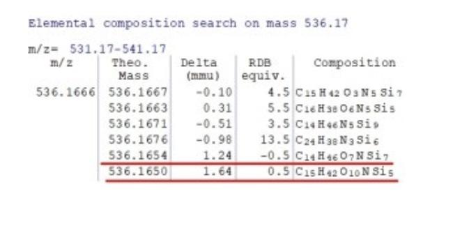 表3 C, H, N, O, Siで計算したm/z 536イオンの分子式