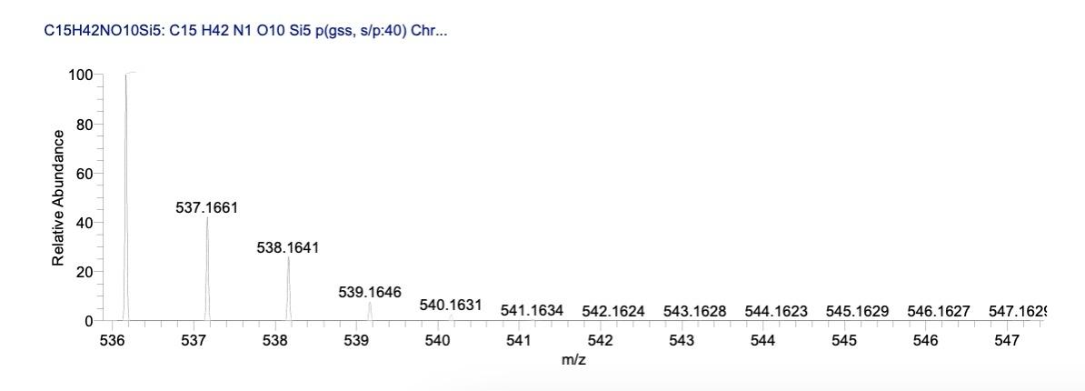 図4のパターンは、実測スペクトルにかなり近く、図1のマススペクトルで観測されているm/z 536イオンの分子式はC14H46NO7Si7であると推測されます。