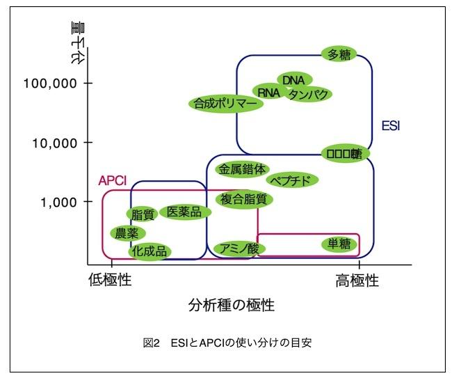 先ずESIとAPCIの使い分けについて、上で“最も汎用的なのはESI”と書いている通り、ファーストチョイスをESIにしている人は多いと思います。私もそうで、特に全くの未知試料を測定する場合にAPCIを用いると、液滴を加熱・気化(脱溶媒)させるプロセスにおいて、試料成分(分析種)が熱分解を起こさないという保証はないので、どうしてもESIがファーストチョイスになります。また、タンパクなどの生体高分子が分析種である場合、ESI以外の選択肢は有り得ません。