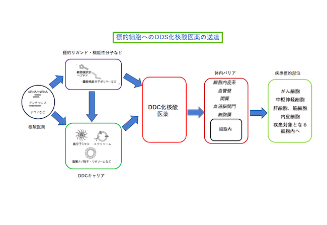 更に、核酸医薬を標的細胞内のターゲットであるミトコンドリアや細胞核に輸送したい場合は、DDSキャリアで標的細胞に輸送し、更に機能性分子を付けてミトコンドリアや細胞核に送る2段階のDDSを考える必要があるのではないでないでしょうか。