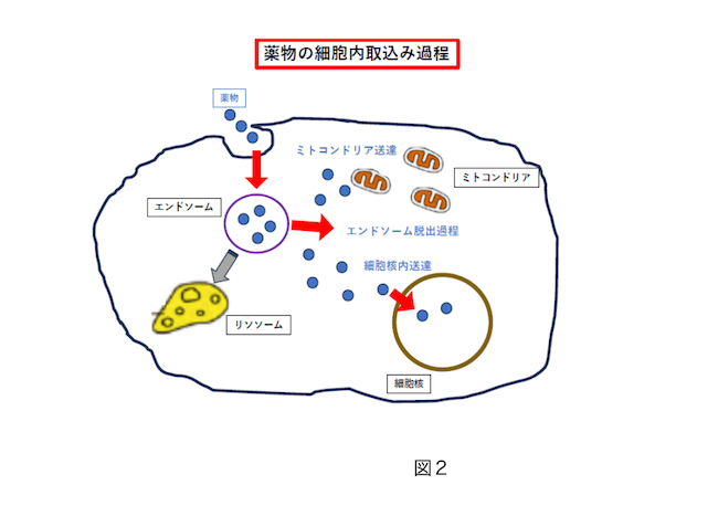 しかし、薬物が細胞内のミトコンドリアや細胞核に作用する場合や、リソソームを利用する場合は、薬物の細胞内への取り込み過程を表した図2のように、エンドソームからどのように放出するかなどの細胞内バリアも考慮に入れる必要があります。