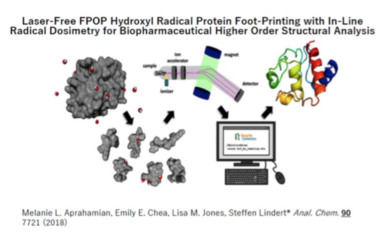 次に以前に説明したLC/MSを用いたHydrogen/Deuterium Exchange(HDX)法を利用して、ターゲットプロテインのDeuterium交換の結果と、ターゲットプロテインとリガンドプロテインでプロテインープロテイン相互作用をしている試料のDeuterium交換の結果を比較することで、ターゲットプロテインのどの部分にシグナル伝達のリガンドプロテインが付いているか解析します。しかしHDX法の場合はLC/MS実験の処理中にDeuteriumがプロトンに戻ってしまう可能性もあります。そこで、一昨年のASMSで発表されたDeuteriumでなくHydroxyl Radicalを用いてトラップする方法だと化学反応で付くので処理中に外れることがなく正確に測定できると考えられます。この方法の詳細と文献は上記の図に示します。但し、この方法は計時変化と付く位置の強さがわからない欠点もあります。そこで、この2つの方法を併用することでプロテインープロテイン相互作用部位の立体構造の推定がつくと考えられます。