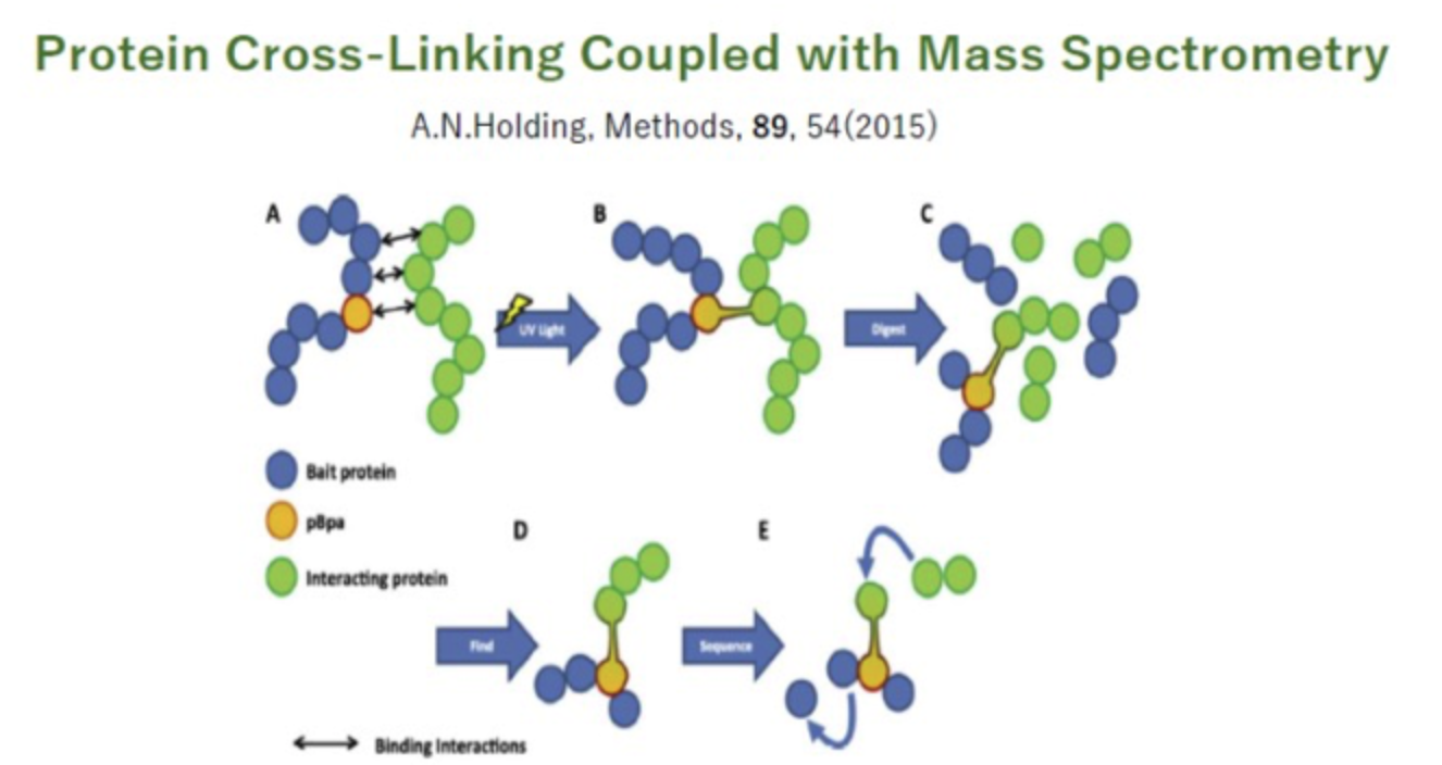 更に、LC/MSを用いたProtein Cross-Linking Coupled法(下記の図参照)を用いるとターゲットプロテインとリガンドプロテインの相互作用をしているアミノ酸の位置をより正確に知ることが出来るので、より詳細なプロテインープロテイン相互作用部位の立体構造が明らかになると考えらます。